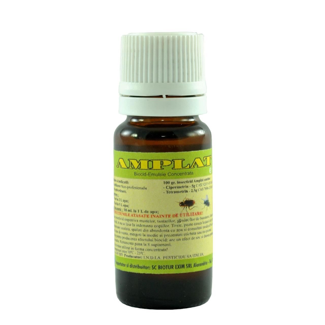 Insecticid cu actiune impotriva populatiilor de insecte daunatoare ce afecteaza sanatatea publica. Efect imediat si durata de actiune prelungita.nCompozitie, 100 grame de produs contin:Cipermetrina 93% cis/trans 40/60...............5 gTetrametrina 92% ....................................2,5 gOxid de butapiperonina min.90% ...............12,5 gEmulsificator si solvent pana la ..................100 gnCaracteristici fizico chimice:Forma de prezentare: solutie lichida de culoare maro inchis.Miros: patrunzator, specific.Capacitate de diluare: Usor solubila in apa la orice concentratie/cantitate.nSfera de actiune:AMPLAT este eficient impotriva unui spectru larg de insecte, ce sunt vectori purtatori ai unor infectii patogene pentru oameni si animale. In particular, actiunea combinata a cipermetrinei cu tetrametrina permite atat controlul asupra insectelor zburatoare cat si al celor taratoare. Produsul are un efect de soc , fiind util si impotriva acelor insecte care traiesc in crapaturi si falii.
