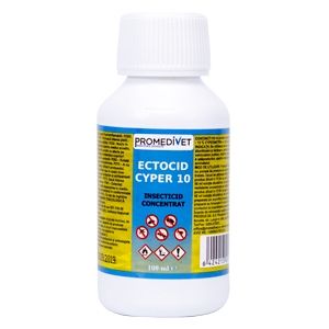 Ectocid Cyper 10, 100 ml are un spectru larg de activitate insecticidă asupra majoritatea insectelor, se utilizează pentru dezinsecţia clădirilor, vehiculelor publice, clădirilor industriale, magazinelor şi a adăposturilor, spaţiilor destinate pentru creşterea animalelor.nCOMPOZIȚIEnnCypermetrin nr. CAS 52315-07-8, nr. CE 257-842-9nn2. ACȚIUNEDatorită substanţei active a soluţiei (Cypermethrina nr. CAS 52315-07-8, nr. CE 257-842-9 – piretroid de sinteză cu spectru larg de activitate şi cu toxicitate scăzută pentru mamifere), produsul este atât un insecticid de contact, cât şi de ingestie, însă fără intervenţia gazoasă, fapt ce prezintă avantajul de a permite repunerea în funcţiune imediată a spaţiilor tratate. Piretrinele au acţiune neurotropă, acţionând la nivelul axonului, atât în sistemul nervos central cât şi periferic. Efectul are loc în două faze: – iniţial se produce o activitate excesivă a celulelor nervoase, cauzând hiperexcitabilitatea insectei, tremor şi convulsii. După această primă fază urmează blocajul transmiterii impulsurilor, blocaj care duce la paralizia şi treptat la moartea insectei. Soluţia antiparazitara, datorită componenţilor, odată cu diluarea acestuia cu apa formează o emulsie lăptoasă, prevenind consumul accidental de către manipulator si o diluţie rapidă si uniformă a substanţei active antiparazitare. La concentraţii obişnuite de utilizare, produsul nu este fitotoxic, are toxicitatea redusă pentru operator, animal si mediu şi este biodegradabil. Produsul este toxic pentru albine si peşti.nINSTRUCȚIUNI DE UTILIZAREnnProdusul diluat trebuie pulverizat cu pompe de presiune pe suprafeţele ce urmează a fi tratate. În cazul majorităţii insectelor produsul Ectocid Cyper 10 se diluează în apă în concentraţie de 1-2% (100-200 ml produs diluat în 10 litri de apă), în funcţie de gradul şi tipul infestării.nÎn cazul gândacilor şi a altor insecte mai rezistente concentraţia se măreşte la 3-4 % (300-400 ml produs diluat în 10 litri de apă). Soluţia preparată este practic inodor si nu pătează pereţii vopsiţi, cu toate acestea se va evita aplicarea sa pe pereţii proaspăt văruiţi, dat fiind că piretrinele sunt instabile în medii alcaline. Amestecul preparat se foloseşte în cursul zilei respective.nnPĂSTRAREnnSe păstrează în ambalaje originale la temperatura camerei (15-25 C˚), în locuri uscate, ferit de lumină.nnMĂSURI DE PRECAUŢIE ŞI AVERTIZAREnnLichid si vapori foarte inflamabili.nNociv în caz de înghiţire.nProvoacă iritarea pielii.nProvoacă o iritare gravă a ochilor.nNociv în caz de inhalare.nFoarte toxic pentru mediul acvatic cu efecte pe termen lung.nA nu se lăsa la îndemâna copiilor!nEvitaţi să inspiraţi vaporii, aerosolii.nEvitaţi contactul cu ochii, pielea sau imbrăcămintea.nA nu se mânca, bea sau fuma în timpul utilizării produsului.nA se utiliza numai în aer liber sau în spaţii bine ventilate.nPurtaţi mănuşi de protecţie şi echipament de protecţie a ochilor, feţei.nColectaţi scurgerile de produs.nEvitaţi dispersarea in mediu.nSe va elimina conţinutul/containerul în conformitate cu reglementările locale.nÎn caz de inghiţire sunaţi la un Centru de Informare Toxicologică sau un medic, dacă nu vă simtiţi bine.nDacă iritarea ochilor persistă: consultaţi medicul.nnPe parscursul utilizării, persoanele neautorizate vor părăsi camera. Produsele alimentare şi hrana pentru animale ambalate necorespunzător, animalele de casă şi cele de crescătorie, precum şi jucăriile, vesela lăsată neacoperită şi alte obiecte de uz casnic se depozitează la loc ferit înainte de începerea aplicării produsului. Acvariile şi spaţiile amenajate pentru creşterea animalelor terestre se acoperă corespunzător (se opreşte ventilarea). Aparatele de gătit, mesele de lucru şi alte suprafeţe de depozitare, pregătire sau consum al alimentelor, precum şi articolele de îmbrăcăminte, cele de mobilă şi altele cu care pielea intră adesea în contact, se acoperă de asemenea corespunzător sau se curăţă, respectiv clătesc înainte de refolosire cu detergent sau substanţe de curăţare alcaline. În spaţiile cu grad de expunere umană ridicată, cum ar fi: camerele pentru bolnavi, grădiniţe, şcoli, camere de locuit, birouri, etc., substanţa nu se aplică pe suprafeţe întinse, ci tratamentul se execută atent vizând prin pulverizare numai cuiburile de dăunători şi zonele din imediata apropiere a acestora. A se evita contactul cu suprafeţele proaspăt stropite şi încă umede. Se va restricţiona accesul copiilor şi animalelor de casă la suprafeţele tratate. Înainte de refolosinţă spaţiile se aerisesc temeinic.