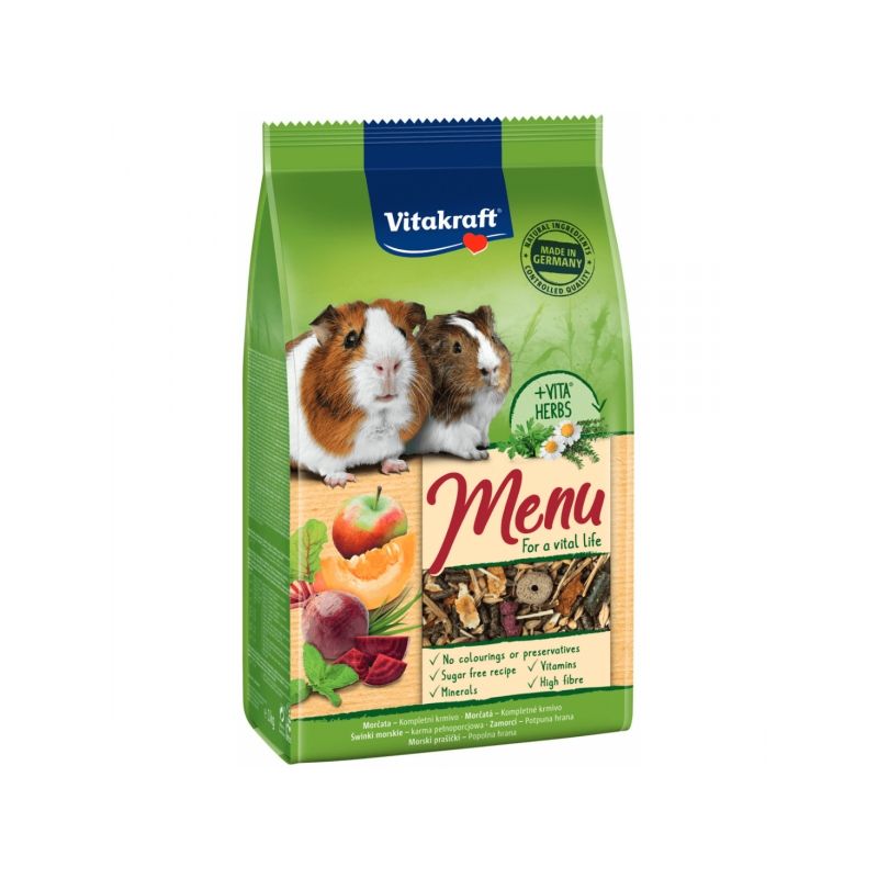 Meniu G Pig Vitakraft 400 g - Hrana completa pentru porcusorii de Guineea, cu seminte, cereale si legume delicioase plus vitamina C.n- Hrana este preparata dupa o reteta fara zahar, arome sau conservanti artificiali.- Fortifica sistemul imunitar pentru rezistenta la boli gratie vitaminei C.- Sporirea vitalitatii este asigurata de complexul vital de vitamine si minerale esentiale.- Mirosurile urate provocate de excrementele si urina din cusca animalelor sunt reduse datorita combinatiei speciale de ingrediente active existente in aceasta hrana.- Stimuleaza digestia si asigura o dentitie sanatoasa datorita continutului de fibre brute. nnMeniul premium pentru o nutritie adecvata porcusorilor de guineea.nEste produs special din produse de cea mai buna calitate, pentru a-i oferi animalutului tau tot ceea ce are nevoie pentru o viata sanatoasa.nFara zahar, fara arome artificiale.nn nnInstructiuni de hranire: 3 lingurita (aprox 30-35g) pe zi. Puneti la dispozitia animalutului apa proaspata in permanenta.nIngrediente: cereale 54,5%, derivate de origine vegetala (sfecla rosie 2,6%, dovleac uscat 1%), fructe (mere uscate 1%), minerale, uleiuri si grasimi (ulei de rapita 0,2%), extract de iuca shidigera.nAditivi nutritionali meniu: 13234 U.I E 672, Vit A; 839 U.I E 671 Vit D3; 420 mg vit.C; 0,115 mg Seleniu; 107,55 mg Fier E1; 0,06 mg E2 Iod; 4,84 mg Cupru; 12,43 mg Mangan; 17,18 mg Zinc.nAditivi tehnologici: 6487,44 mg clinoptilolit.nnAmbalaj: 400 g