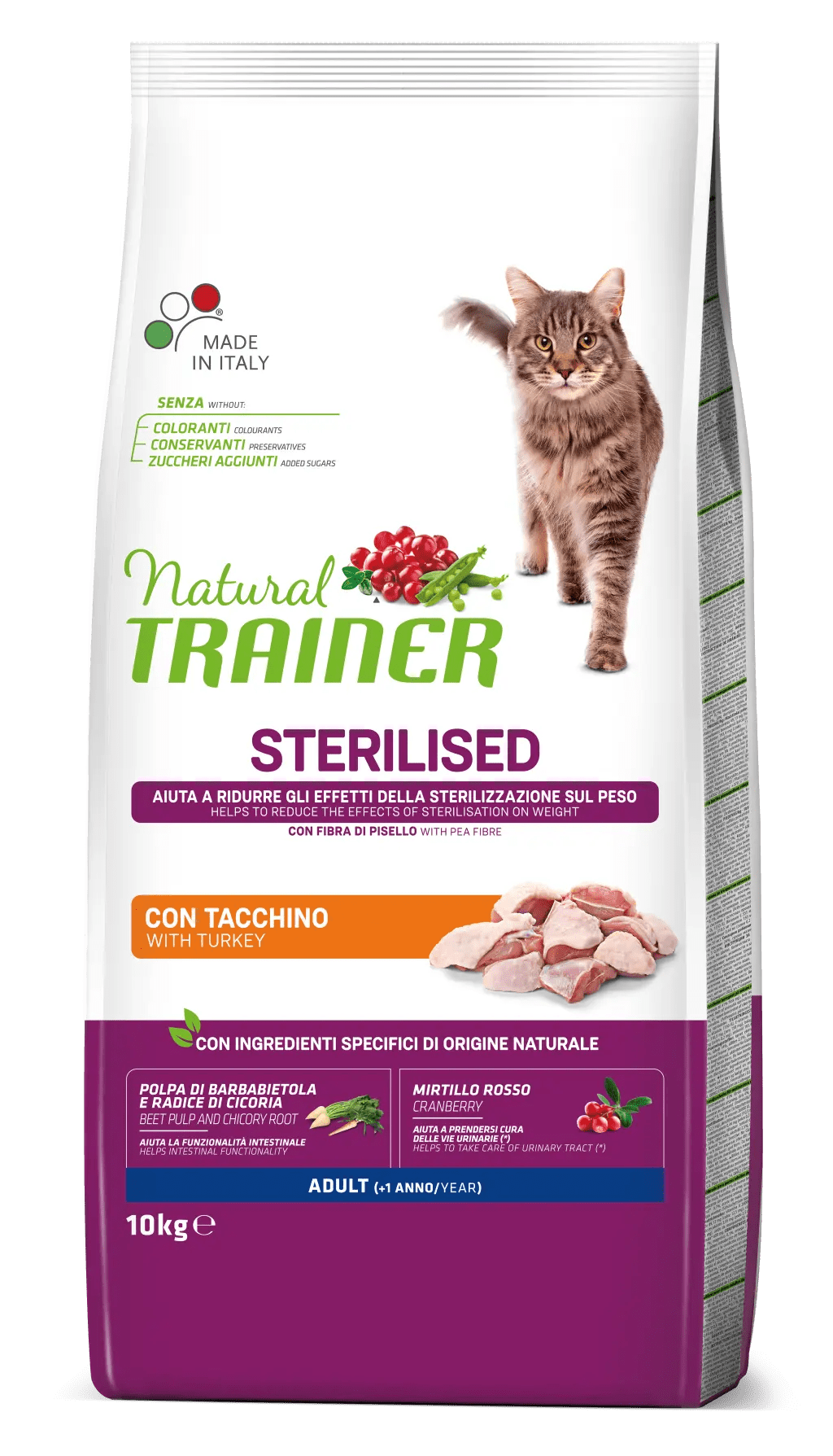 Cu curcan.nCu extract de merișoare.nCu fibre din mazăre**. nnHrană Super Premium Naturală completă și echilibrată pentru pisicile adulte sterilizate începând cu vârsta de 1 an.nBeneficii:nnReduce efectele sterilizării asupra greutății corporale – cu o formulă adaptată, care includ fibre, cum ar fi fibrele din mazăre, și un aport moderat de grăsimi pentru reducerea conținutului energetic al hranei.nSusține sănătatea intestinală – cu prebiotice de origine naturală provenite din extractul de rădăcina de cicoare și pasta de sfeclă, care susțin dezvoltarea microbiotei intestinale care asigură o funcționare corectă a sistemului digestiv.nSusține sănătatea pielii și a blănii – acizii grași omega-3 și omega-6, alături de biotină și de zinc susțin sănătatea pielii și frumusețea blănii.nSusține sănătatea tractului urinar – merișoarele și extractul natural de cicoare, alături de un nivel controlat al mineralelor susțin sănătatea tractului urinar.nSănătatea dentară – cu vitamina C într-o formă specială pentru a reduce depunerea tartrului.